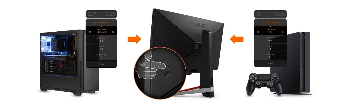 A monitorok PC-vel és konzolokkal is tökéletesen együttműködnek, azonban váltás esetén a legtöbb monitornál bemeneti forrásonként újra kell konfigurálni minden beállítást. A MOBIUZ termékcsalád ebben is segít! Az intuitív Scenario Mapping automatikusan kiválasztja a kívánt beállításokat, miután bemeneti forrást választottál. Ha játszani támadna kedved, a monitor beállításával már nem kell foglalkoznod. Mindemellett az 5 irányú joykar segítségével egyszerűen hozzáférhetsz a Quick OSD-hez, hogy pillanatok alatt elérj minden képjavító funkciót. A Quick OSD és a Scenario Mapping kombinált kényelmével műfajtól függetlenül is tökéletes élményben lehet részed.