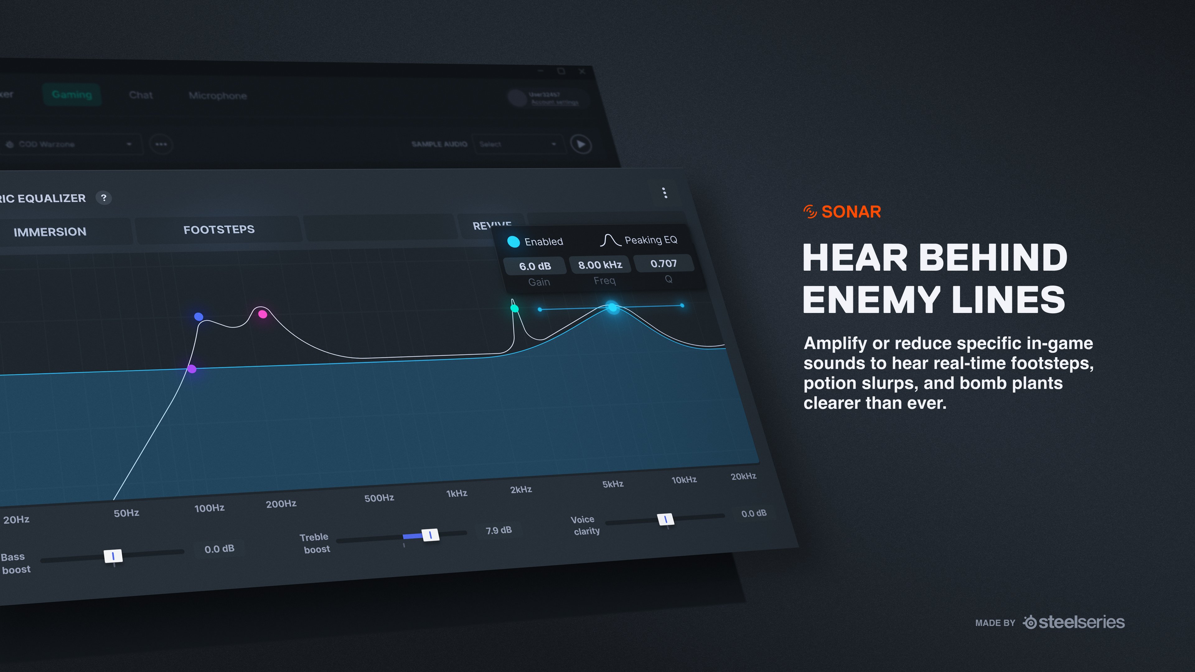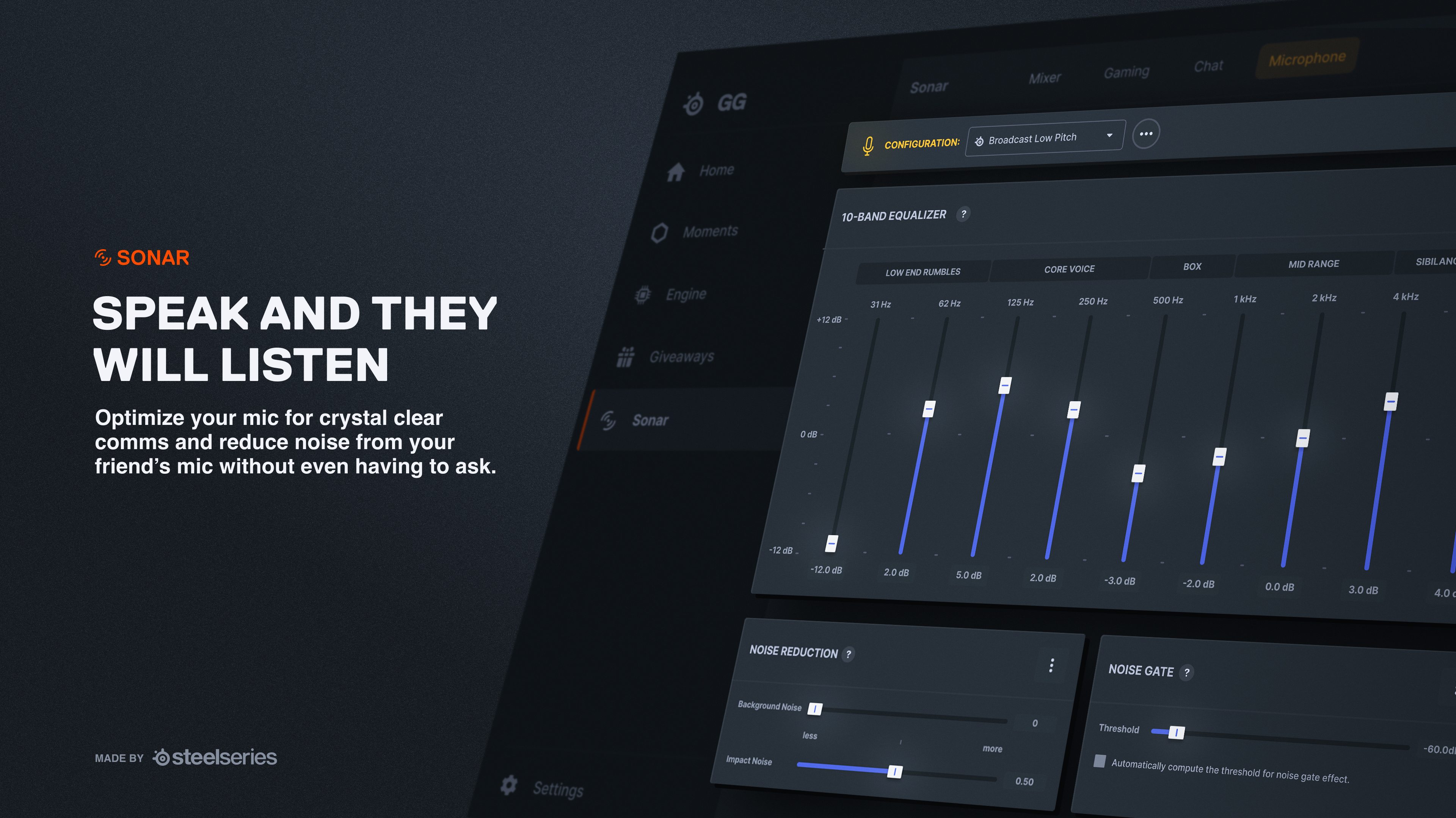 Mivel a kommunikáció kulcsfontosságú a játékban, az új AI-alapú zajszűrős mikrofon kristálytiszta kommunikációt biztosít a gamereknek, a Sonar Audio Suite pedig elnémítja a billentyűzet, a számítógép-ventilátorok és egyéb háttérzajokat. A ClearCast Gen2 mikrofon valódi előnyt biztosít a gamereknek pontosan ugyanazzal a kétirányú mikrofon kialakítással, amelyet a Forma-1-es csapatok használnak a kristálytiszta, természetes hangzás érdekében, mindezt tökéletes zajszűréssel.