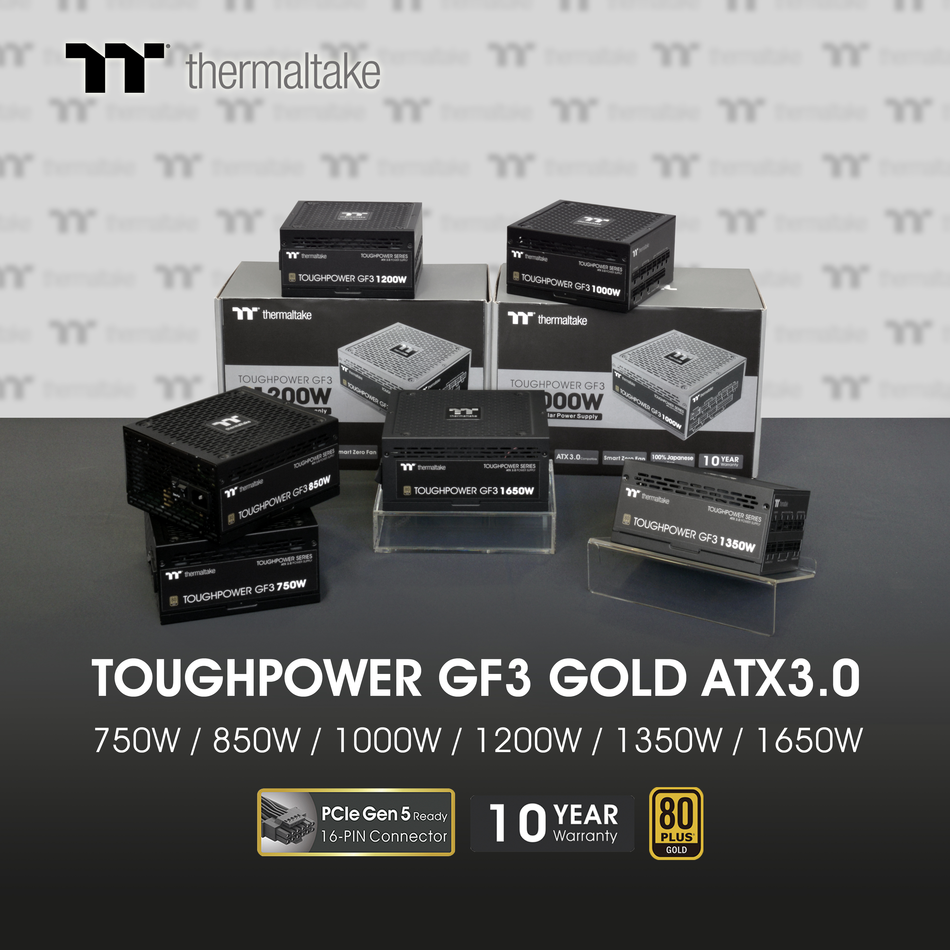 Kezdjük a Toughpower GF3 sorozattal! A teljesen moduláris termékcsaládot egy natív 12+4 pines PCIe Gen 5 csatlakozóval tervezték meg, valamint kompatibilis az Intel ATX 3.0 specifikációjával is, így készen áll a következő generációs PCIe által kínált új élmény feltárására. Különlegesség, hogy a GF3 1650W natívan két PCIe 14+2 pines csatlakozót is támogat, így egyidejűleg képes ellátni két csúcskategóriás grafikus kártya áramfelvételi igényeit. A teljesen moduláris Toughpower GF3 sorozat 1650, 1350, 1200, 1000, 850 és 750 W-os választható kapacitással és 80 PLUS Gold hitelesítéssel érkezik. A kiemelkedő teljesítményt nyújtó Toughpower GF3 sorozat 100%-ban kiváló minőségű, Japánban készült kondenzátorokkal érkezik. Hovatovább, a teljes sorozat megbízható és stabil működést, valamint egyenletes és tiszta teljesítményt nyújt a feszültségstabilitás révén.