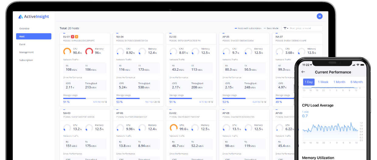 Az Active Insight lehetővé teszi a Synology NAS-rendszerek állapotának ellenőrzését különböző mutatószámok és előzmények tendenciái alapján asztali számítógépen vagy mobileszközökön egyaránt. Ezeket az adatokat a munkaterhelések modellezésére és a teljesítményproblémák megoldására is lehet használni.