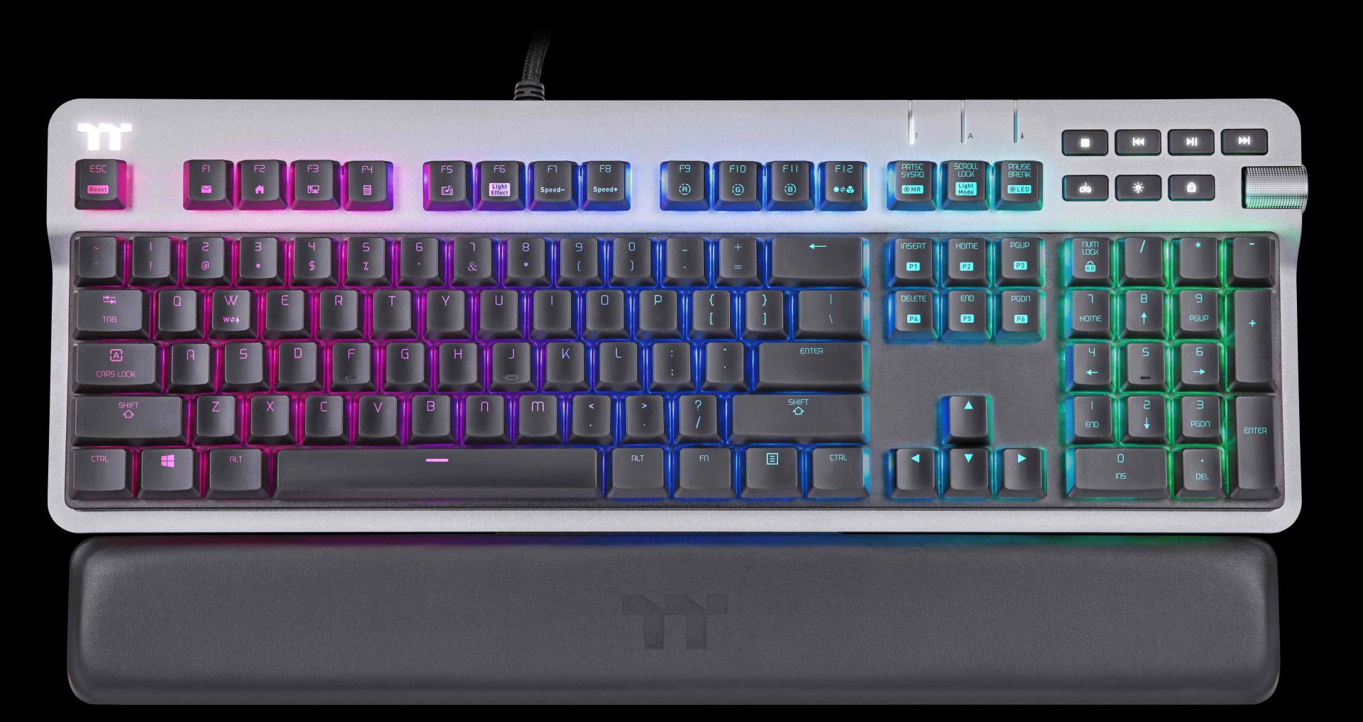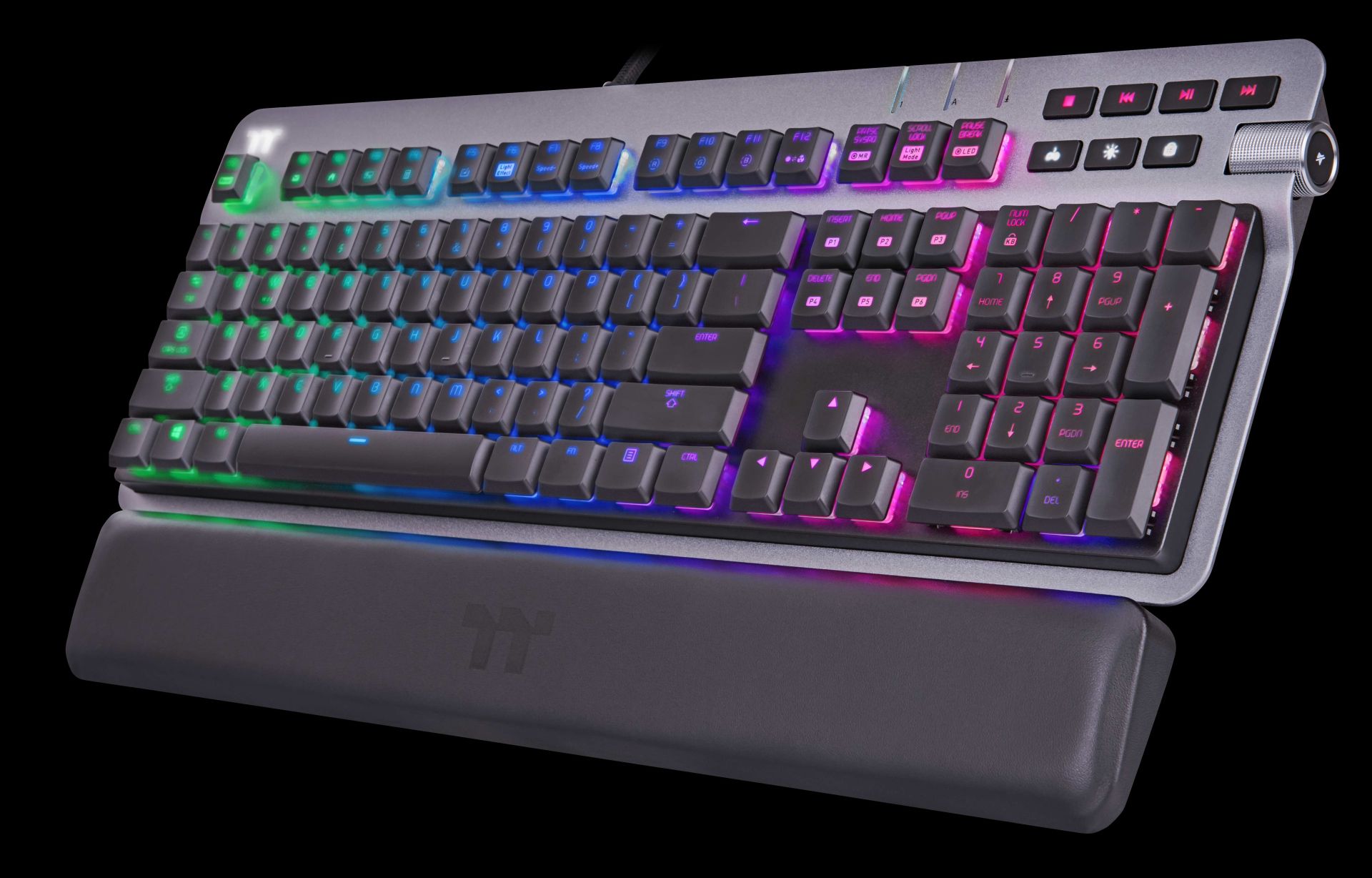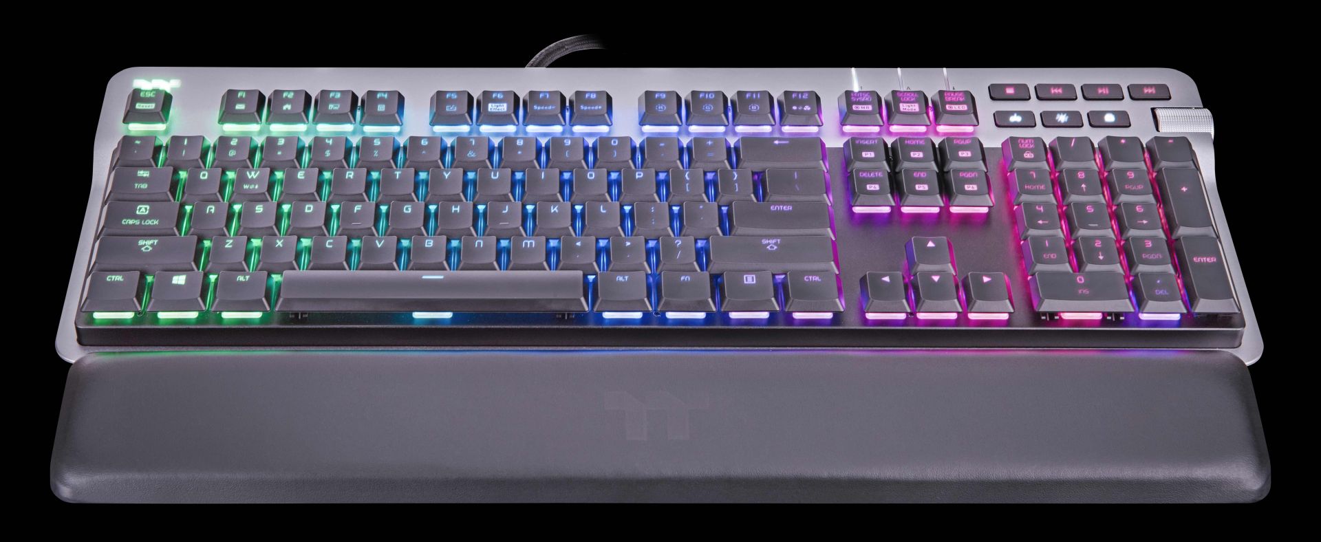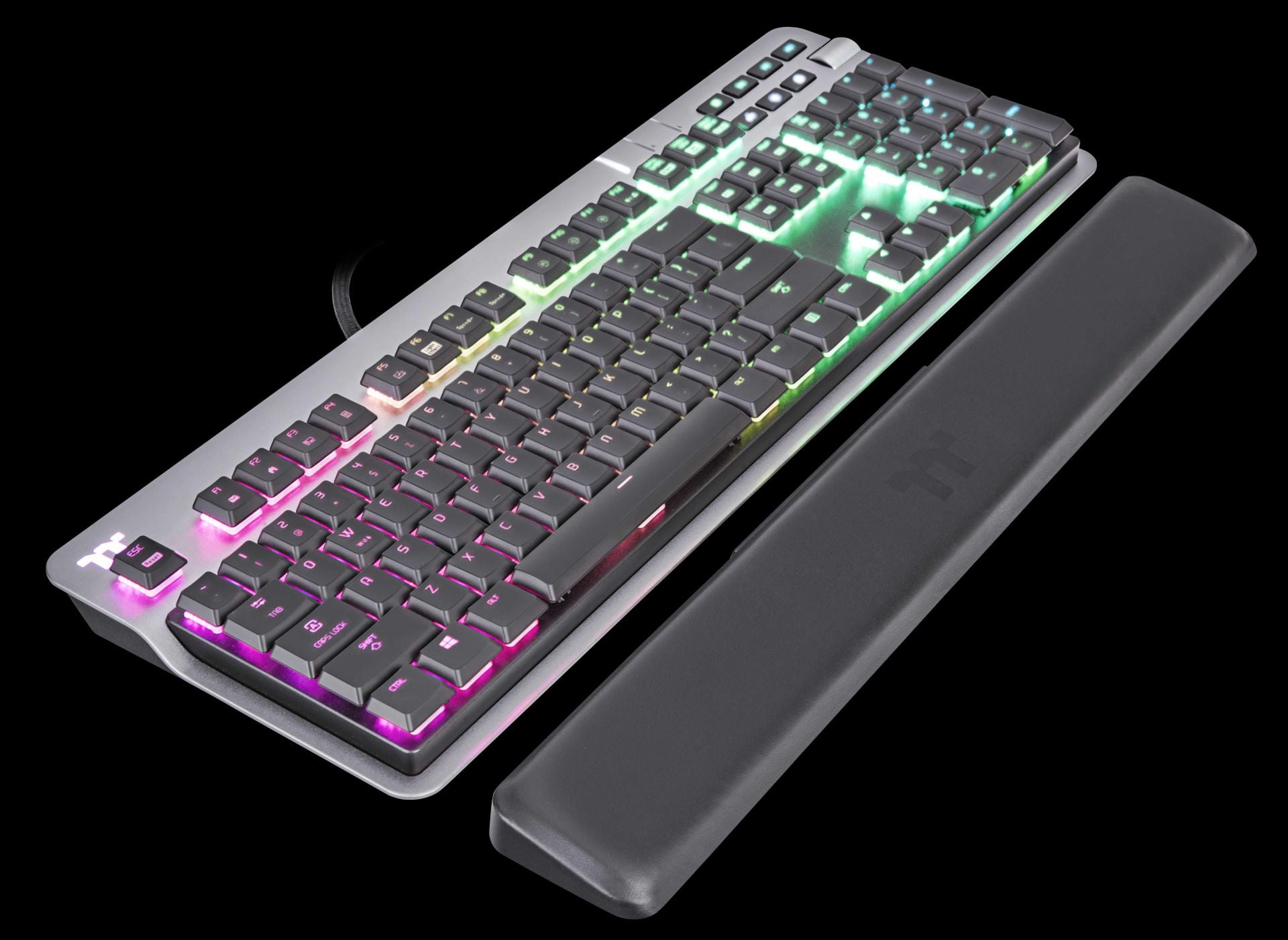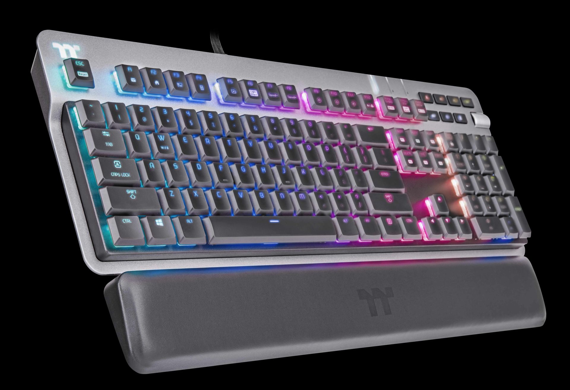 A teljesítményre és az esztétikára tervezett Thermaltake ARGENT K6 RGB alumínium fedlappal, lebegő billentyűsapkás kialakítással és gombonkénti háttérvilágítással rendelkezik, így a felhasználók stílusosan merülhetnek el kedvenc játékaikban. Egy másik remek funkció a multifunkciós tekerőgombos hangerőszabályozó a billentyűzet jobb oldalán, amely lehetővé teszi a felhasználók számára a hangerő beállítását, valamint a weboldalak közötti egyszerű váltást. A felhasználók a TT iTake szoftveren keresztül akár teljesen személyre is szabhatják a gomb funkciót. További extra teljesítményfunkciókat is kínál, beleértve a multimédiás vezérlőket, a makrók rögzítését, valamint az elülső oldalon található audio- és USB-csatlakozókat is.