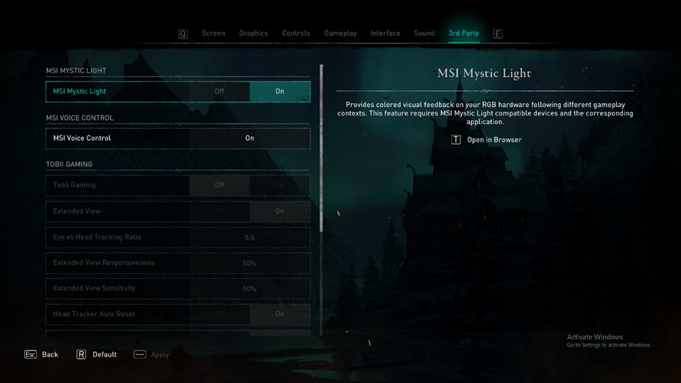 5. Lépj be a játékba és válaszd ki a beállítások → harmadik fél menüpontot, és kapcsold be az „MSI Mystic Light” és az „MSI Voice Control” lehetőséget!