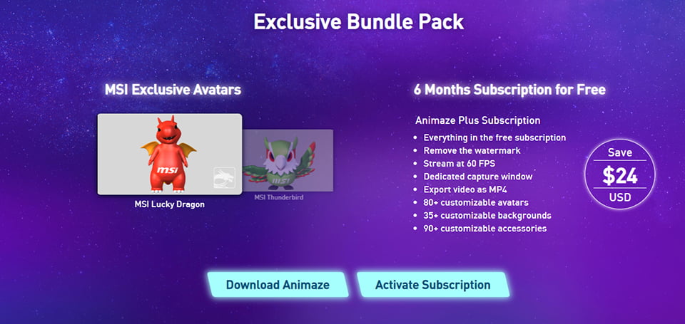 Ha MSI laptopot használsz, szerencsés vagy! Nemcsak 2 exkluzív MSI avatárt használhatsz, beleértve Lucky-t, a sárkányt és a Mennydörgésmadarat, hanem egy 24 USD értékű, 6 hónapos Animaze Plus előfizetést is kapsz ingyen.